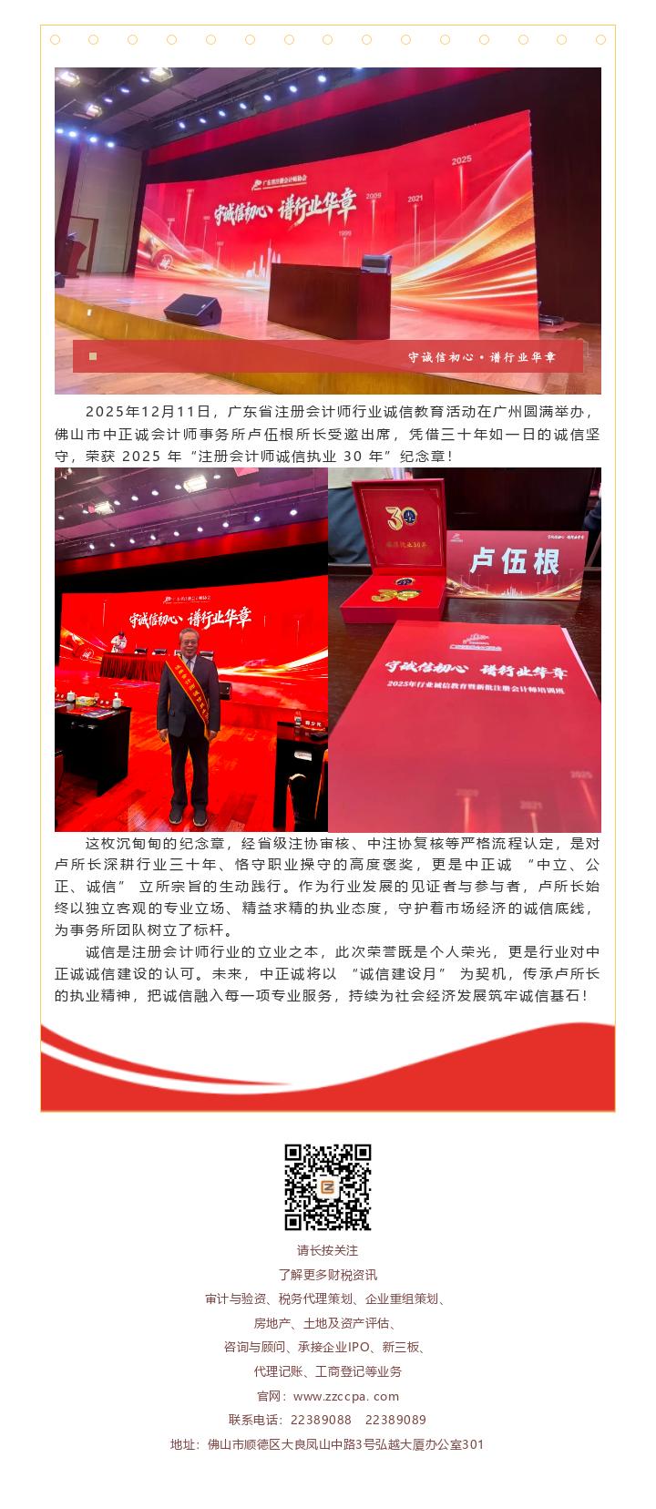 【简讯】中正诚会计师事务所卢伍根所长获颁2025年“注册会计师诚信执业30年”纪念章