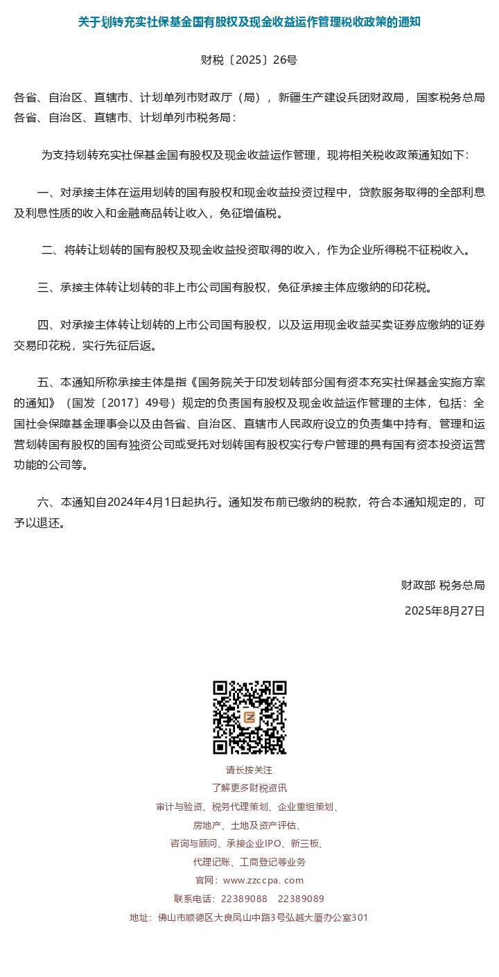 【财税法规】财政部、税务总局发布《关于划转充实社保基金国有股权及现金收益运作管理税收政策的通知》